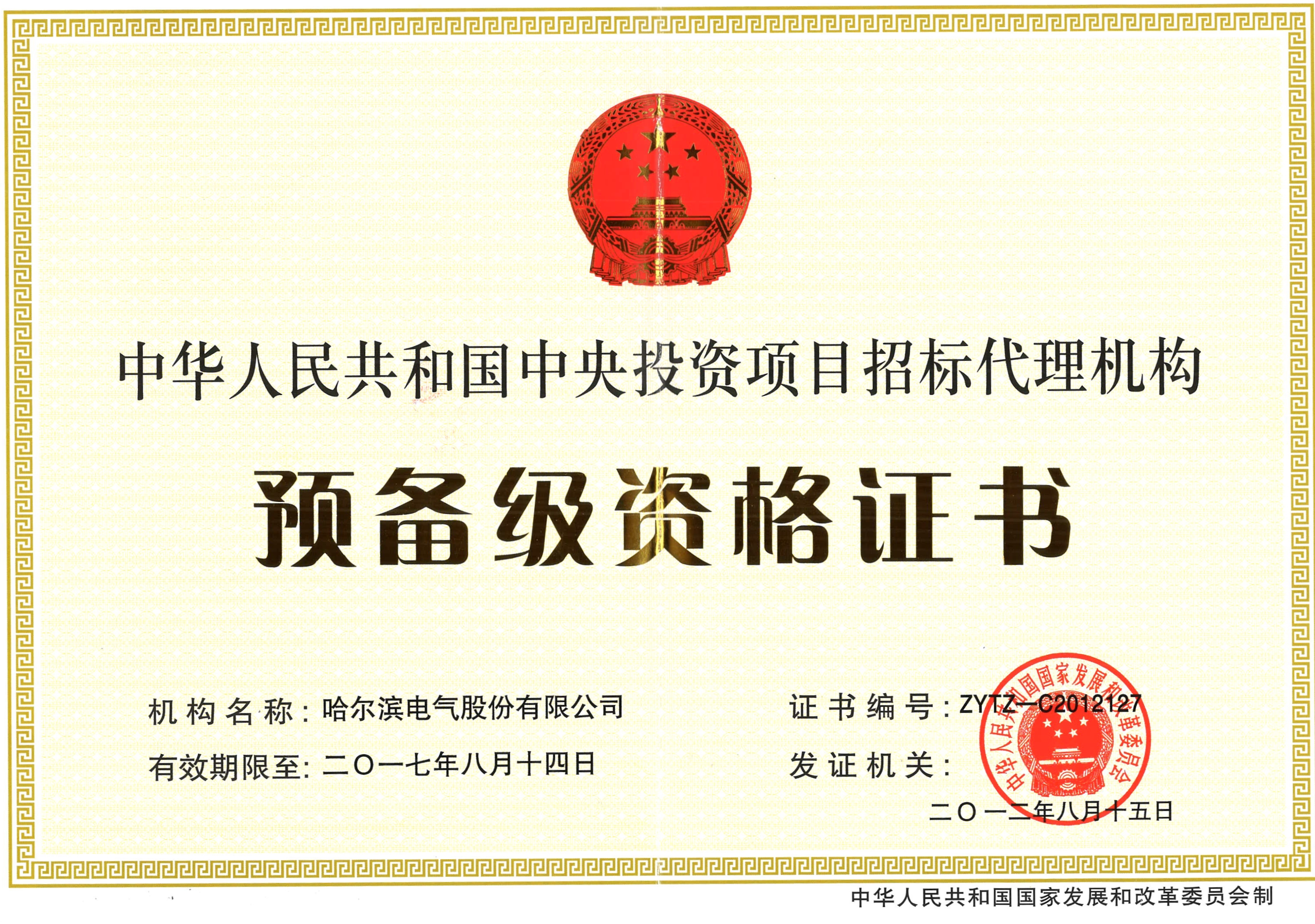 2012年8月15日哈电集团招标中心获得由国家发展和改革委员会颁发的中央投资项目招标代理机构预备级资格证书
